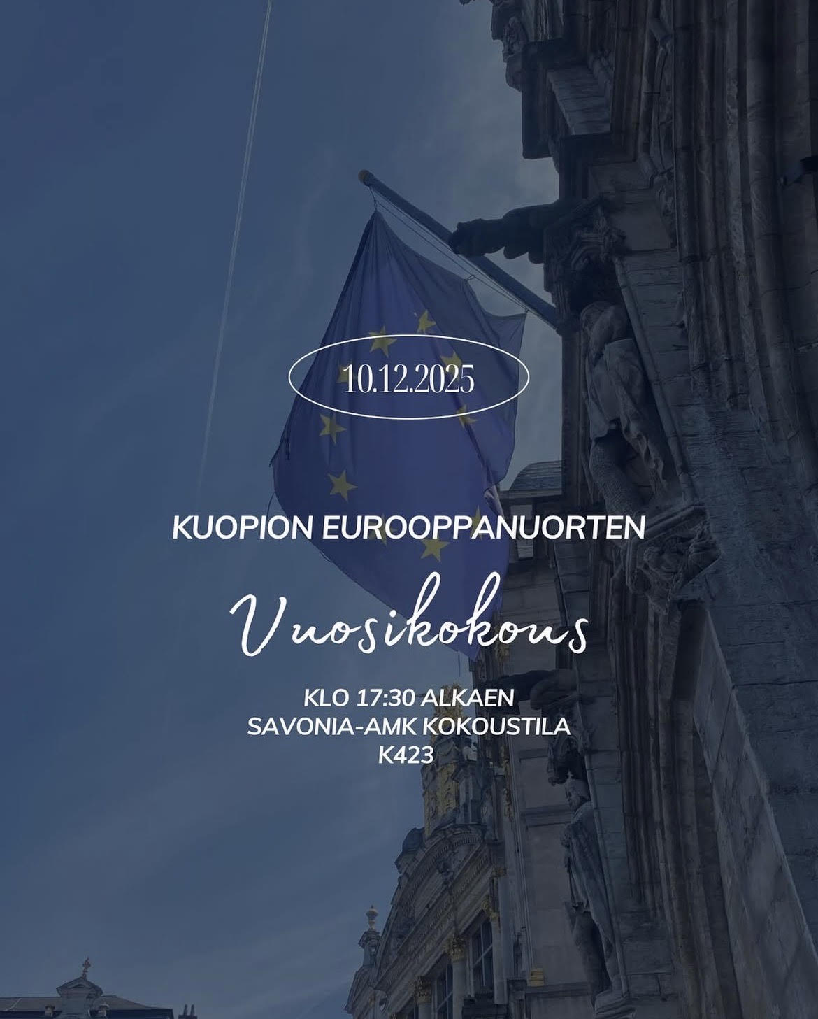 Posted onTurun Eurooppanuorten vuoden 2026 hallitus on valittu 8.12.2025 Keskiviikkona 3.12. pidettiin Turun Eurooppanuorten vuoden 2025 vuosikokous Turku-salissa. Kokouksessa käytiin puheenjohtaja-, varapuheenjohtaja- sekä hallitusvaali. Turun Eurooppanuorten hallitus kiittää kaikkia kokoukseen osallistuneita ja ehdolla olleita! Turun Eurooppanuorten puheenjohtajaksi vuodelle 2026 valittiin Ada Jaakkola. Varapuheenjohtajiksi valittiin Essi Valtonen ja Emma Leino. Hallitukseen valittiin Veera Kosunen, Liia Matikainen, Emilia […]